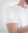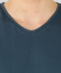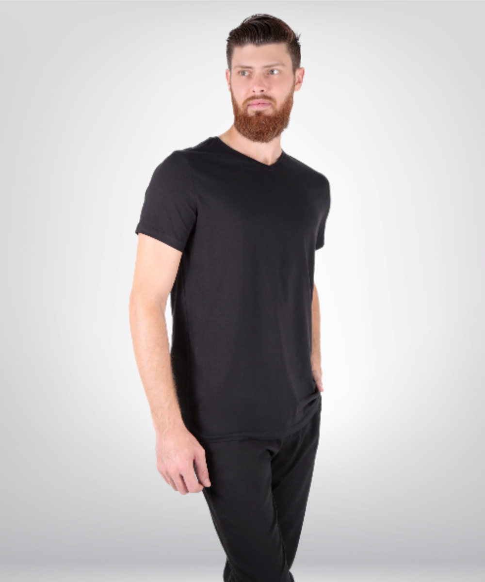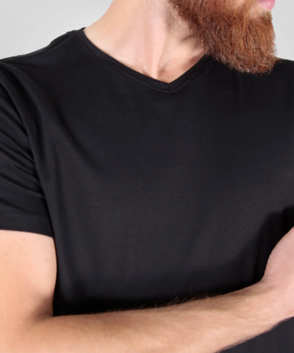 Gola desenvolvida com entretela de memória elástica, garantindo que o desenho em V permaneça impecável após centenas de lavagens.